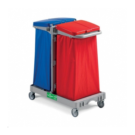 Chariot Tri Sélectif Alpha 4102. 1 base 95x53 cm avec roues ø 100 mm. 1 Couvercle support sac 102 L bleu. 1 Couvercle support sac 120L rouge. 1 sac 120L plastifié bleu. 1 sac 120L plastifié rouge